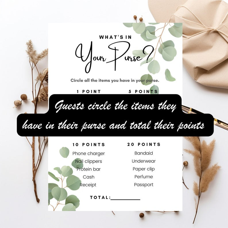 What's In Your Purse Game, Printed + Shipped, Bridal Shower Game, Wedding Shower Game, Purse Game,Minimalist Bridal Shower, Bridal Games